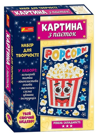 кешбэк от 39 ₴-41%199 ₴324 ₴190 ₴Акция:16:19:48Бесплатная доставка сКартинка из паеток Попкорн 10100533У Ranok-Creative (333931652)Принадлежность ДетямКартина из пайеток - отличный набор для развития творчества ребенка. Все составляющие содержатся в наборе: цветные пайетки, гвоздики, цветная схема, основа из пенопласта, подробная инструкция.