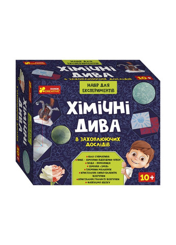 Привет, любитель экспериментировать и познавать новое! У тебя появилась возможность провести интересные эксперименты дома, создать маленькую домашнюю лабораторию. Увлекательных тебе экспериментов! Эксперименты: - Белая субмарина - Яйцо - химическая подводная лодка - Вода - помощница - Тайный рисунок - Химическая «змея» - Кристаллические сине-голубые узоры - Кристаллические игольчатые узоры - Раскрашиваем цветок Набор содержит: медный купорос, хлорид аммония, глюконат кальция, хлорид кобальта, лимонную кислоту, сухое топливо, желатин, пищевой краситель, пищевую соль, шпатель, столовый оцент, кисточку, соду, мерный стаканчик, пипетку, ложку, чашку Петри, белый лист, розовый лист, защитные очки. защитные перчатки, стаканчики, салфетку, сахар, пошаговую инструкцию. Возраст: 10-15
