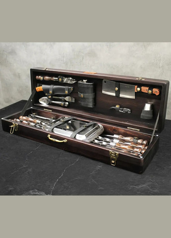 В набор входит (43 примета): •Качественная деревянная коробка, трансформирующаяся в стол; •Удобная ручка из кожи, мягкая, комфортная и надежная; •Шампура из нержавеющей стали 6 шт. толщиной 3 мм, очень надежные, можно сказать вечные, деревянные лакированные ручки. Ширина: 12 мм. Длина 630 мм; •Двойной шампур для овощей; •Двойной шампур для приготовления больших куриных ножек, больших кусков мяса, рыбы и овощей. нержавейка 3 мм; •Решетка-гриль для рыбы; •Раскладная мангал-рамка, у вас всегда будет с собой мангал; •Вилки 6 шт., теперь они всегда с собой); •Вилка для снятия шашлыка и чистки шампуров толщиной 3 мм; •Штопор-открывалка; •Качественный шеф-нож; •Фонарик; •Турбо зажигалка; •Дощечка для нарезки – соусница; •Топор с дополнителем ножом в ручке и кресалом; •Тарелки из нержавеющей стали6 шт.; •Карты пластиковые непромокаемые; •Фляга из нержавеющей стали с кожей; набор для соли и специй; •Стаканчики в чехле – 6 шт.