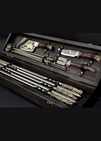 Набор шампуров Люкс Nb Art Звери в кейсе из бука+нож кабан+вилка кабан 47330148 1. Кейс из массива бука. Ручки из канатов . 2. Нож охотничий с лезвием из нержавеющей стали 40х13, Общая длина 258 мм, рукоять из клена, 3. Вилка для снятия шашлыка с лезвием из нержавеющей стали 40х13, рукоять из клена, 4. Шампура: 6 штук, твердая пищевая нержавеющая сталь толщиной 3 мм. Длина шампура: общая - 69 см; рабочая -45 см Рукоять: ювелирное художественное литье из бронзы (при использовании ручка не нагревается).