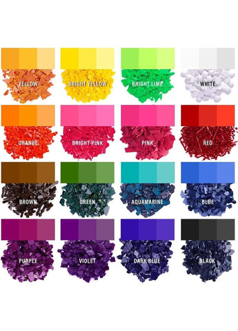Набор восковых красителей для изготовления свечей, цветные красители - Улучшите свои свечные изделия с помощью нашего премиального набора восковых красителей. 16 ярких, индивидуально окрашенных красителей идеально подходят для любого типа воска и гарантируют потрясающий результат каждый раз. Восковые красители для изготовления свечей, жидкий краситель для свечей - Достигните безупречных свечей с помощью нашего растворимого воскового красителя для свечей. Никаких сгустков, никакого шелушения - только яркий цвет, который выдерживает испытание временем. Раскройте свой творческий потенциал с уверенностью. Краситель для соевых свечей Совершенствуйте свои соевые свечи с помощью нашего точного красителя для соевого воска. Дозировка зависит от содержания жира. При использовании наших цветных чипсов учитывайте исходный цвет воска. Тщательно смешайте их, чтобы получить желаемый оттенок. Раскройте свою фантазию и создайте свечи, которые превзойдут ваши ожидания. Наши премиальные красители для свечей - это не просто яркие цвета. Они веганские, не вызывают раздражения и бережно относятся к коже. Создавайте свечи с чистой совестью, используя наши высококачественные красители.
