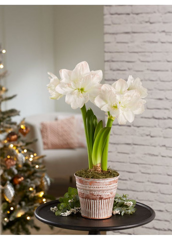 Амариллис Lovely Nymph (Лавли Нимф) — принадлежит к махровым формам амариллисов, которые отличаются обильностью лепестков и исключительной декоративностью. Его цветки имеют до 20 лепестков, образующих густую, компактную чашу диаметром до 20 см. Лепестки среднего размера, нежно-розовые с белыми штрихами ближе к центру – этот рисунок придает цветку легкий, свежий вид без чрезмерной пестроты. Растение формирует до двух цветоносов, на которых обычно раскрывается от 2 до 5 цветков, иногда с незначительным смещением во времени, что удлиняет декоративный эффект. Этот сорт имеет приятный, средней интенсивности аромат, хорошо ощущаемый в помещении, но не удушающий. Он особенно ценится за способность формировать стойкий цветонос высотой 50-60 см, не требующий дополнительных подпор, даже при полном распускании цветов. Благодаря этому сорт смотрится аккуратно и не теряет вертикальную структуру. Листья появляются, как правило, после формирования цветоносов, имеют насыщенно-зеленый цвет, блестящий, длиной до 45 см. После завершения цветения декоративность растения поддерживается именно листьями. Особенностью сорта является его стабильность к внешним стрессам – он редко поражается типичными для амариллисов болезнями, такими как красная гниль (stagonospora curtisii), при соблюдении базовых условий хранения луковиц. Кроме того, благодаря обильному цветению и легкому уходу сорт часто используют как подарочное растение в горшках — он хорошо транспортируется и держит декоративность даже во время длительных переездов. Идеальные условия для выращивания: посадка амариллиса в цветочном горшке может быть осуществлена в разное время года. Лучше всего это делать весной, хотя можно начать и поздней осенью, если сезон оказался теплым. Для посадки необходимо выбрать горшок, который будет глубоким, но не очень широким, чтобы корни растения имели достаточно места для развития. Важно также обеспечить надлежащий дренаж на дне горшка, используя, например, битый кирпич или керамзит. Почва должна быть рыхлой и богатой питательными веществами, с хорошей водопроницаемостью. Посадка амарилиса в почву обычно производится в мае-июне, когда погодные условия способствуют активному росту растения. Достаточно важным этапом является выбор места для посадки: культура любит хорошо освещенные участки с питательной почвой, поэтому если почва бедная, можно добавить гумус и органические удобрения. При посадке луковицы должны находиться на глубине около 20 см с расстоянием 30 см между ними. После посадки полив следует производить умеренно, чтобы не стимулировать чрезмерный рост зеленой массы, что может отрицательно повлиять на цветки. Когда цветонос достигнет высоты 7-10 см, необходимо увеличить полив и установить опору для стебля. Учитывая, что его цветение приходится на осень и зиму, когда световой день короче, растению следует добавлять искусственное освещение. Лучшими местами для его расположения есть южные или юго-восточные окна. Что касается влажности, амариллис не требует дополнительного опрыскивания, если влажность в комнате нормальная. Однако если воздух слишком сух, можно слегка увлажнить почву. В период покоя опрыскивание прекращается. Во избежание пересыхания почву можно увлажнять раз в 20 дней. Полив должен быть умеренным, особенно при вегетации. Когда цветонос дост