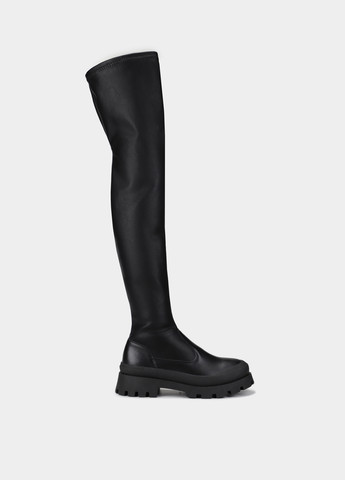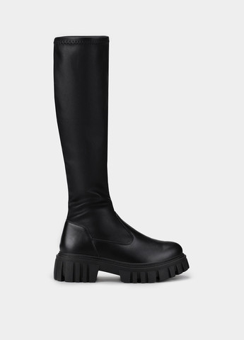 Черные ботфорты 'Tristan' из экокожи стрейч, утеплены экомехом по щиколотку или флисом. Подходят для еврозимы. Имеют высоту от пятки 51 см и подошву 8 см/4 см. Размеры рассчитаны на среднюю стопу. Маломерят, поэтому обратите внимание на замеры.