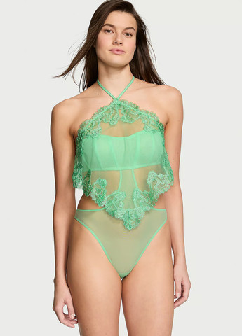 Зеленый эротический полупрозрачный пеньюар "Боди" (монокини, теди, игровой костюм, костюм для ролевых игр) из цветочного кружева через шею c треугольными удлиненными чашечками и вырезом капля под ними по центру, под грудью вшита широкая атласная лента с завязками сзади, внизу трусов сзади большой прямоугольный вырез.