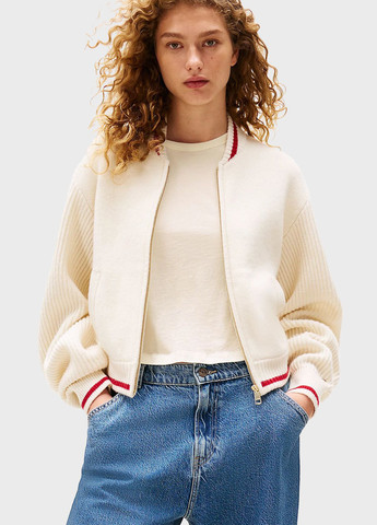 Бомбер из 100% шерсти с высоким воротником и длинным рукавом. Карманы спереди. Застежка на молнию спереди. Ребристая обработка.