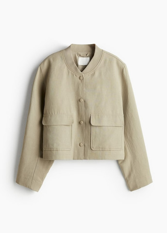 Слегка укороченный жакет-бомбер из ткани на основе льна и лиоцелла. Свободный крой, небольшой ребристый воротник, застежка на кнопки спереди и карманы с клапанами. Слегка спущенные плечи, подплечники и длинные рукава. На подкладке. Возможно повреждение внутренней бирки и отсутствие бумажной бирки. Для размера М: ПОГ - 62 см, длина - 54 см.