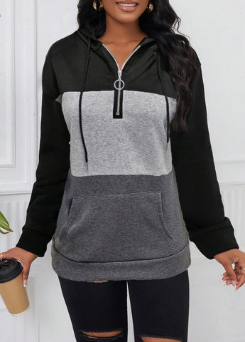 Женское худи с капюшоном на молнии в стиле пэчворк контрастных цветов. Это худи с длинными рукавами, цветными блоками и капюшоном на горловине выполнено из полиэстерового трикотажа с лёгкой эластичностью. Застёгивается на молнию и имеет карманы. Подходит для повседневной носки в прохладную погоду (10–17 °C/50–63 °F). Можно стирать в стиральной машине или чистить в химчистке.