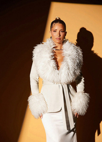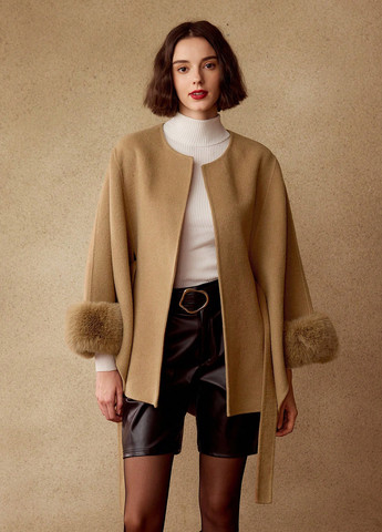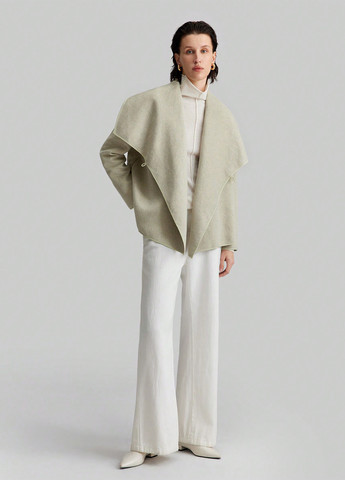 Полупальто имеет конструкцию без воротника и двойные карманы, имеет застежку на пуговицы спереди и обычные рукава. Ткань не тянется, имеет обычную форму подола. Имеет круглый вырез и однобортную планку. Оно не включает никаких дополнительных карманов.