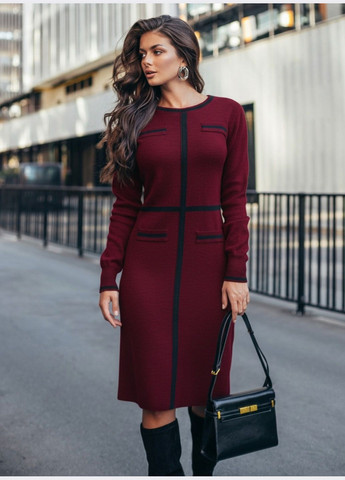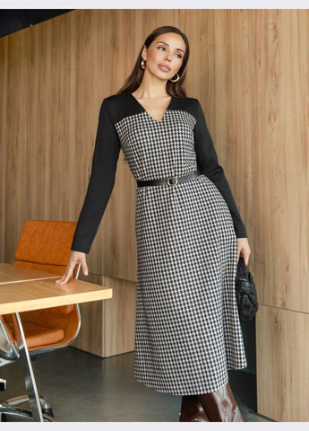 Элегантное платье из трикотажа в гусиную лапку. Однотонная вставка на плечах и по линии декольте вместе с рукавами визуально сужает плечи и делает акцент на V-образном вырезе. Отрезное по талии. Длина миди и приталенный силуэт, который мягко расширяется к низу, обеспечивают свободу движения. Застёгивается на скрытую молнию. Ремень в комплекте позволяет акцентировать талию.