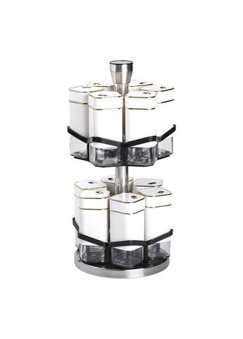 Набор банок для специй из 12 штук на подставке-карусели - это идеальное решение для организации специй на кухне, сочетающее функциональность и стильный дизайн. Баночки изготовлены из прозрачного стекла, что позволяет легко определять содержимое и контролировать его количество. Герметичные металлические крышки надежно сохраняют свежесть и аромат специй, защищая их от влаги и посторонних запахов. Основные характеристики: Количество баночек: 12 штук; Размер набора: 15х15х32.5 см; Объем баночки: 120 мл; Материал баночек: стекло/пластик; Материал подставки: металл; Тип подставки: Карусель; Назначение: Для хранения специй, трав, соли, перца. Особенностью набора является удобная подставка-карусель, обеспечивающая легкий доступ к каждой баночке. Подставка изготовлена из прочного пластика и металла, что обеспечивает долговечность и стойкость конструкции. Компактный и эстетический дизайн подставки позволяет организовать специи максимально эффективно, сохраняя порядок на кухонном столе или шкафу. Этот набор банок станет незаменимым помощником для кулинаров, помогая удобно хранить специи, травы, соль, перец или смеси приправ. Благодаря высокому качеству материалов и универсальному дизайну, он также станет отличным подарком для любителей кулинарии. Особенности и преимущества: Качество: Товар изготовлен из материалов, отвечающих современным стандартам качества, что гарантирует его высокую прочность и долговечность в использовании. Удобство: Легкий в использовании и уходе, идеальный для ежедневного использования, обеспечивая комфорт в любой ситуации. Стиль: Современный дизайн и элегантный вид, подходящий к любому интерьеру или