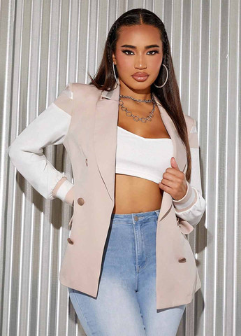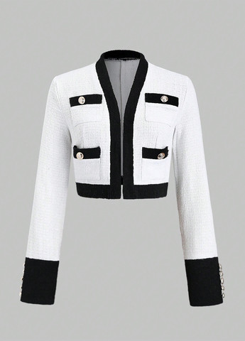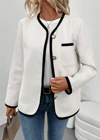 Жакет RueChic с контрастным воротником и пуговицами спереди. Этот элегантный жакет с отложным воротником и длинными рукавами застегивается на пуговицы спереди и имеет классический крой. Выполнен из хлопчатобумажной ткани. Дизайн – колорблок. Подходит для весны и осени. Рекомендуется машинная стирка.