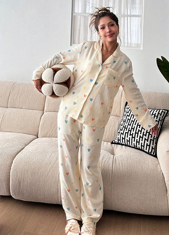 Пижама (рубашка, брюки) SHEIN. Рубашка с отложным воротником и длинными рукавами. Брюки прямого кроя, длинные.