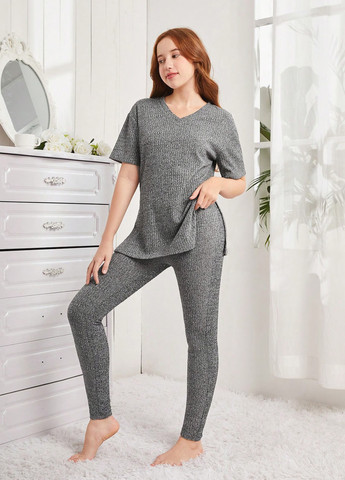 Футболка и брюки в тон для домашнего ношения. Комплект имеет круглую горловину с широким вырезом.