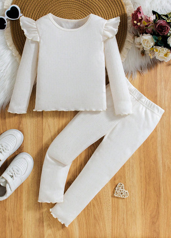 Комплект представляет собой белую пижаму с круглым вырезом для девочек. Он выполнен из эластичной ткани. Модель однотонная.