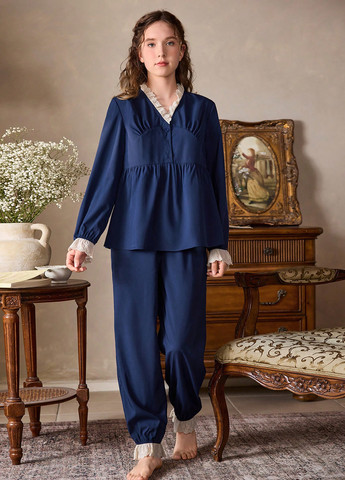 Пижамный комплект SHEIN для девочек-подростков, темно-синего цвета, из тканого материала. Комплект включает рубашку с длинными рукавами, V-образным вырезом и застежкой на пуговицы спереди. В комплект также входят длинные брюки. Ткань не тянется. Машинная стирка, не подвергать химчистке.