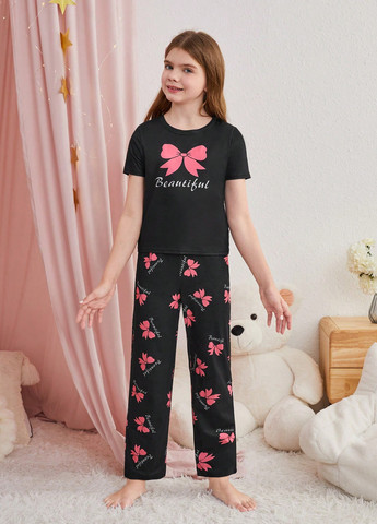 Летняя повседневная пижама для девочек с узором в виде бантика, безопасная, изготовлена из слегка эластичной ткани. Включает комплект из двух предметов с круглым вырезом.