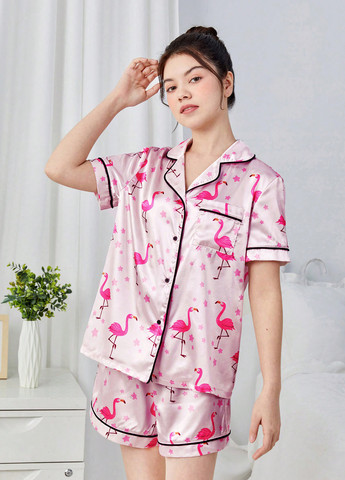 Пижамный костюм с принтом розового фламинго. В комплект входит рубашка с короткими рукавами и вырезом с лацканами. Ткань не тянется.