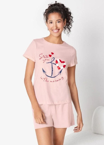 Женская пижама, комплект для дома бренда Esmara. Состоит из футболки и шорт. Футболка с круглым вырезом горловины, короткий рукав, принт спереди. 100% экологичная текстильная печать. Шорты однотонные, в поясе удобная резинка без завязок. Комфорт при ношении благодаря хлопку. Материал мягкий и приятный к телу.