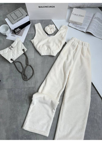 Женская пижама (топ+брюки+резиночка). Изготовлена из качественной двухсторонней фактурной бахромы. Этот материал невероятно мягкий, пушистый и приятный для тела с обеих сторон. Он прекрасно сохраняет тепло, создает ощущение уюта и комфорта, идеально подходя для прохладного времени года. Благодаря своим тепловым качествам и удобству, пижама идеально подходит для комфортного сна, отдыха дома или утреннего ритуала. Уютный комплект, состоящий из топа, брюк и мягкой резиночки для волос.