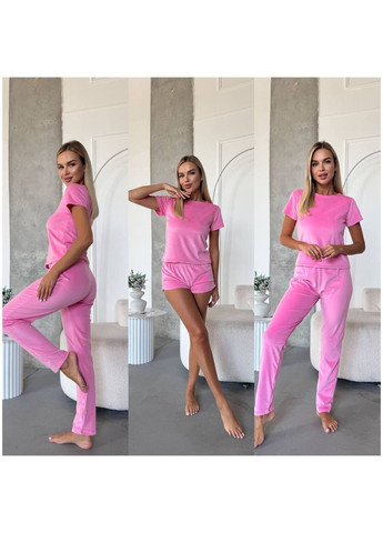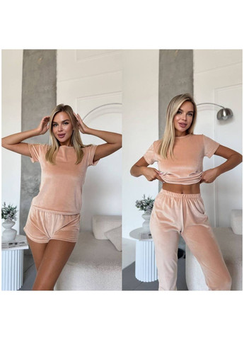 Нежная плюшевая пижамка украсит каждую девушку. В комплект входит футболка, брюки и шорты. Любите себя и будьте дома красавицами. В наших комплектах реально. Велюр – это изысканная и теплая ткань, износостойкая, не теряющая форму и цвет при частой стирке. Размерная сетка: S-M: Объем груди – 80-95 см; Длина кофты – 56 см; Объем бедер – 88-103 см; Длина штанов – 96 см; Длина шорт: перед - 25,5 см; сзади 32 см. L-XL: Объем груди – 95-106 см; Длина кофты – 57 см; Объем бедер – 97-109 см; Длина штанов – 97 см; Длина шорт: перед - 26 см; сзади 34 см.