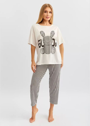 Женская пижама тройка 3 в 1 с принтом кролика, размер единый на 42-46р Подходит также как пижама для подростков. В комплекте: штаны, футболка с короткими рукавами, шорты. Размер и параметры изделия: Размер - 42-46 (S-L) (один размер) Штаны: - Длина: 90см - Шаг: 58 см. - Эластичность пояса: 28 - 51см. Шорты: - Длина: 37 см Футболка: - Общая длина: 55 см Объем груди: до 105 см Рекомендации по уходу: Уход за вещами деликатная стирка; гладить на низкой температуре Перед первым использованием рекомендуем постирать.