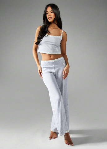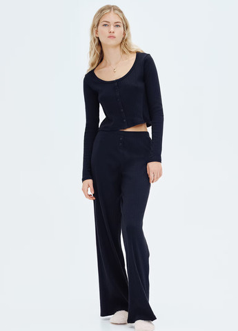 Низ – свободные брюки на высокой посадке с эластичной резинкой для идеальной посадки и максимального комфорта. Талия и низ брюк украшены нежными рюшами, создающими игривый и одновременно изящный акцент. Такой фасон смотрится легко, свободно и подходит любой фигуре.