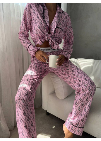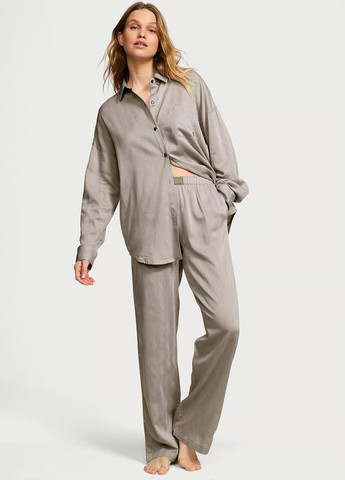 Женская пижама Victoria's Secret. Женская пижама Victoria's Secret выполнена из ультрамягкой смеси модала и хлопка – воплощение мечты. Комплект состоит из рубашки на пуговицах и штанов. Пижама имеет оверсайз крой. Пижамная рубашка с длинным рукавом и нагрудным карманом с вышитым логотипом, отложным воротником. Застегивается на пуговицы. Брюки на эластичном поясе.  Нашивка с логотипом бренда спереди на поясе. Брюки имеют два кармана в швах. Отличное качество