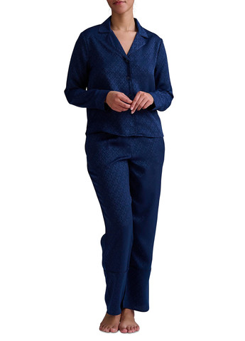 Женская пижама Tommy Hilfiger. Классический пижамный комплект для дома и сна, который состоит из рубашки и штанов. Выполнена из легкой приятной к телу ткани. Рубашка на пуговицах. Отложной воротник. Длинные рукава. Штаны с эластичным поясом на резинке. Два кармана по бокам. Принт - монограмма бренда в тон по всей поверхности пижамы. Отличное качество.