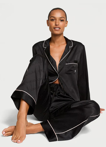 Атласная пижама Victoria’s Secret. Устройтесь поудобнее в этой стильной блестящей атласной пижаме. Это идеальный подарок для вас или любимого человека. Комплект состоит из рубашки и штанов. Рубашка застегивается на пуговицы, есть нагрудный карман с вышитым логотипом бренда. Штаны с эластичным поясом с атласными завязками. Два кармана по бокам. Машинная стирка.