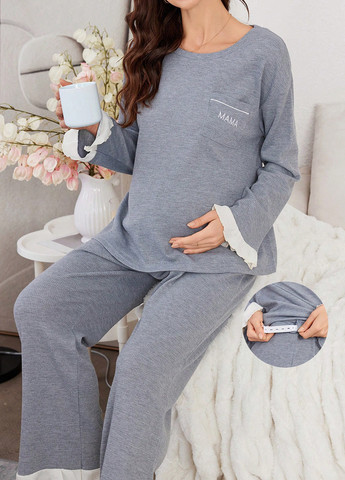 Этот комплект одежды для беременных предлагает комфорт и стиль. В комплект входят топ и брюки свободного кроя. Особенности включают вышитые буквы, удобный карман и слегка эластичную ткань. Имеет круглый вырез и обычные рукава.
