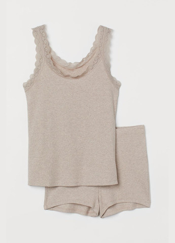 Эластичная пижама из хлопкового трикотажа в рубчик из майки и шорт. Майка с кружевом, шорты на резинке. ***Размер - XS Полуобхват пояса шорт - 28,00 см Длина майки - 55,00 см Объем груди - 60,00 см Полуобхват бедер - 34,00 см Длина шорт - 28 см Возможно повреждение бирки