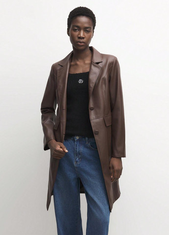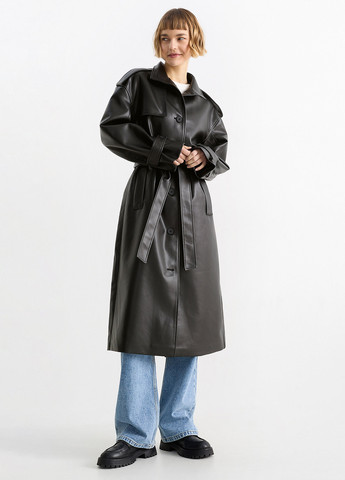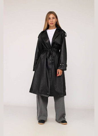 Для тренчу вибрали гладку та м'яку екошкіру. Тренч на підкладі, застібається на об'ємні ґудзики. Модель доповнена оригінальними декоративними елементами – відлітні кокетки по переду і спинці, погони на плечах.