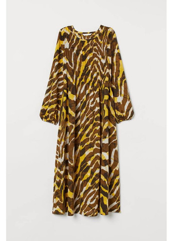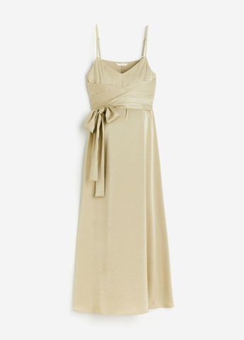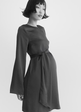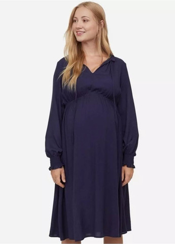 Платье-миди для беременных из воздушной вискозной ткани с добавлением блестящих нитей. Круглый вырез горловины на узких завязках спереди и с треугольным вырезом горловины. Длинные пышные рукава с присборенным швом сверху, манжеты на узкой резинке. Юбка отрезная по сборке снизу. На подкладке в виде трикотажного нижнего платья с треугольным вырезом из полиэстера на узких регулируемых бретелях.