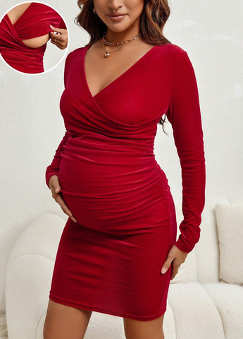 Платье для беременных с длинным рукавом и натуральной талией. Особенности включают в себя облегающий крой, карандашный низ, V-образный вырез, дизайн с запахом, оборки и эластичную ткань для комфорта во время беременности.