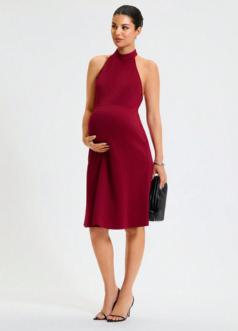 Платье для беременных элегантного дизайна с воротником-халтером из эластичного трикотажа. Расклешенный подол длиной до колена отличается облегающим кроем, высокой линией талии, отсутствием карманов и застежкой на пуговицу.