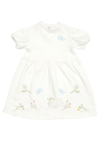 Короткие рукава с мягкой резинкой не давят и придают образу легкости, а декоративная вышивка в виде растений и бабочек создает атмосферу сказки и весенней нежности. Позади платья предусмотрена аккуратная пуговица для удобного переодевания.