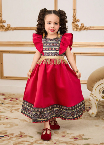 Традиционное платье для девочек-подростков. Это элегантное платье расклешенного А-силуэта. Круглый вырез горловины и короткие рукава с оборками. Можно стирать в стиральной машине.