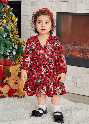 Платье для девочки выполнено в красную новогоднюю клетку. Имеет длинный слоновий рукав и расклешенный подол. Платье имеет завышенную талию и V-образный вырез. Изготовлен из эластичной ткани.