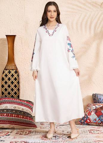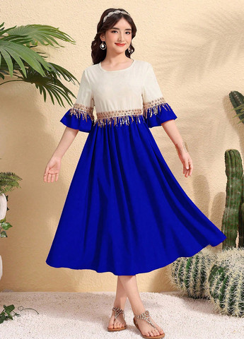 Длинное элегантное платье для девочек-подростков. Имеет бахрому и богемный стиль. Классический крой имеет расклешенный низ и завышенную талию.