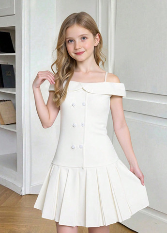 Стильное платье для девочек, изготовленное из мягкого и приятного микровельвета. Модель бежевого цвета с длинными рукавами украшена декоративными пуговицами спереди, элегантными воланами на манжетах и поясом сзади, что подчеркивает талию. Идеально подходит для повседневной носки на осенне-весенний сезон.