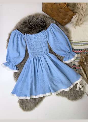 Силуэт платья – трапециевидный, крой – прямой, что позволяет ребенку свободно двигаться, не сковывая движений. На груди и спинке пришита рельефная оборка, а также прямая широкая оборка по низу изделия. На задней части изделия – застежка с пуговицами, которая заканчивается в середине спинки. Характерными особенностями муслина являются износостойкость и практичность, наша двухслойная ткань, именно это делает ее прочной.