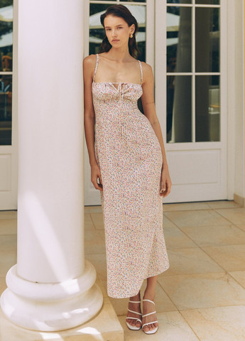 Дизайнеры разработали эксклюзивный акварельный принт 'Мальва', отражающий гармонию с природой, дающий ощущение легкости. Эта идея дополняет общий настрой коллекции, которая пронизана энергией весеннего пробуждения. Мальва – это не просто цветок для украинцев. Она является символом украинской деревни, любви, счастья, мудрости и преданности. Каждый цвет этого цветка имеет свое значение – красная символизирует любовь и гармонию, розовая – нежность и женственность, желтая – богатство и процветание. Романтическое шелковое платье макси с нежным цветочным принтом. Модель стилизована эффектным вырезом на спинке и завязкой сзади. Воротник-стойка застегивается на однотонные пуговицы. Слегка расширенный крой юбки подчеркивает изящный силуэт. Платье не просвечивается благодаря двойному слою ткани. Модель отлично подойдет для особых случаев или выхода на вечер. С платьем можно создать много образов, соединив с классическими босоножками или туфлями-лодочками, пиджаком и сдержанными аксессуарами в виде серьг или браслета.