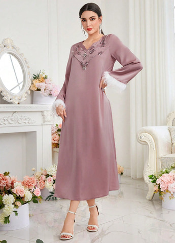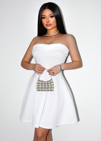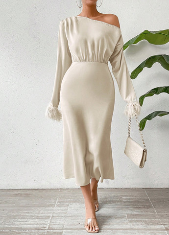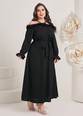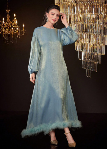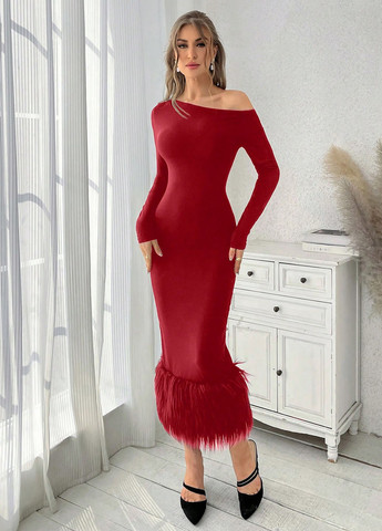 Это платье А-силуэта с открытыми плечами в стиле пэчворк доступно в королевском синем цвете. У него длинные рукава с обычным фасоном, завышенная талия и расклешенный край. Платье имеет открытый вырез, контрастную отделку из искусственного меха, застежку-молнию и однотонный узор.
