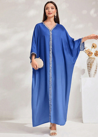 Длинное платье с асимметричным подолом, поясом и карманами. Оно имеет элегантный V-образный вырез, рукава «летучая мышь» длиной до запястья и завышенную линию талии. Изготовленная из тканого материала, она имеет стандартную посадку и большую длину.