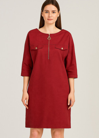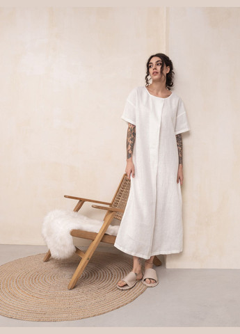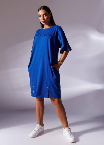 Модель имеет прямой силуэт и мягко ложится по фигуре. Круглый вырез с декоративными вырезами на плечах подчёркивает линию декольте, а россыпь блестящих заклёпок на воротнике добавляет изысканный акцент. Полупрозрачная текстура в сочетании с подкладкой создаёт эффект многослойности, придавая образу глубину.