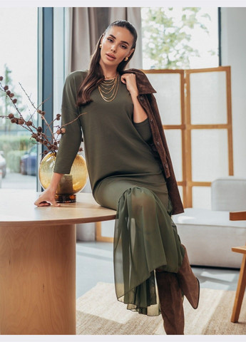 Платье миди с шифоновой оборкой — удачное сочетание комфорта и интересного дизайна. Рукава ¾, круглый вырез горловины и прямой крой делают изделие универсальным решением для повседневных образов. Контрастный акцент — нижняя вставка из полупрозрачного шифона создаёт многослойность. Изделие без застёжки. Замеры изделия в 44 размере. длина по спинке – 126 см. длина рукава (от горловины) – 54 см.
