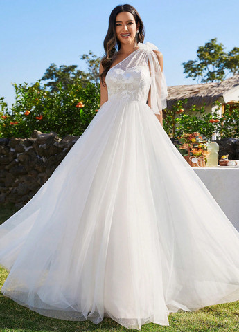 Элегантное асимметричное платье на одно плечо. Это свадебное платье украшено жемчужными аппликациями и вышивкой. Имеет стандартный крой с застежкой-молнией и накладкой на груди. Ткань не тянется.