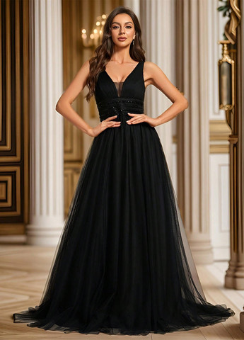 Материал Полиэстер, Фатин / Цвет Черный / Фасон С пышной юбкой, Со шлейфом, Клеш, А-силуэт, С открытой спиной / Длина изделия Макси / Стиль Вечерний