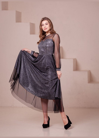 Блестящее расклешенное нарядное серебристое черное платье на длинный рукав