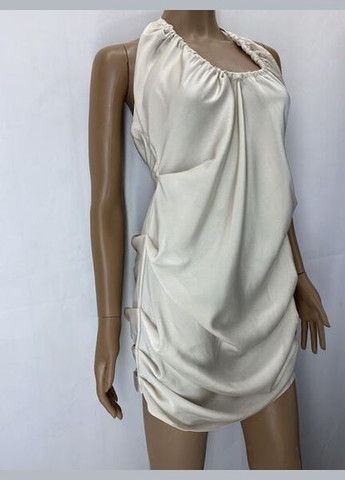 ASOS (001515) Коктейльное сатиновое платье-мини цвета айвори с драпировкой без рукавов с открытыми плечами. Драпировка по бокам и сзади, застежка на пуговицы на спине. Страна бренда -Великобритания, страна производства – Шри Ланка.